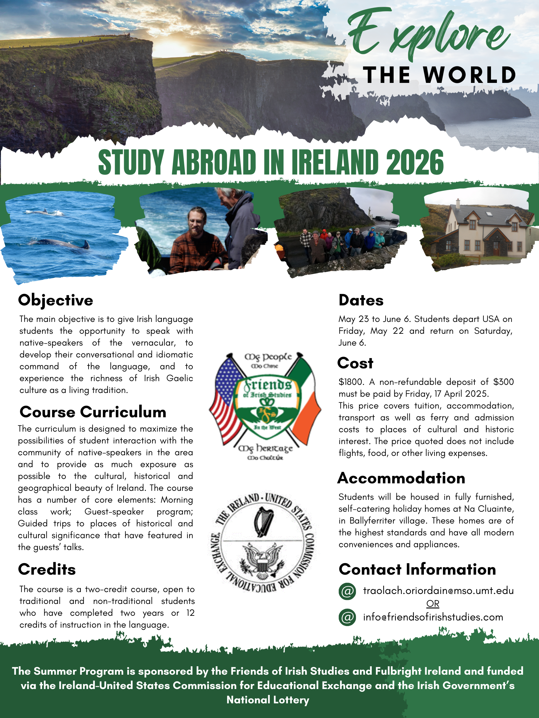 The Summer Program is sponsored by the Friends of Irish Studies and Fulbright Ireland and funded via the Ireland-United States Commission for Educational Exchange and the Irish Government’s National Lottery